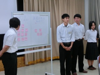 第1回の取組では、古里社会保険労務士事務所 代表 古里 健一氏を講師にお迎えし、「進路先決定のために必要なこと」というテーマで講演をしていただきました。座談会では、3年生希望者15名と4名の経営者が、4班に分かれ座談会を実施しました。進路先決定を間近に控え、参加者した3年生は、全員真剣に質問したり情報収集をしていました。 講演会