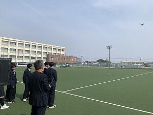 講義ではドローンの機体特性や技術的側面及び関連法規,危険性をはじめ,先生のご研究や実証実験の紹介がなされました。また,赤外線カメラ搭載のドローンが紹介され,屋外でのデモンストレーションでは、操縦時における注意事項についてご指導いただきました。