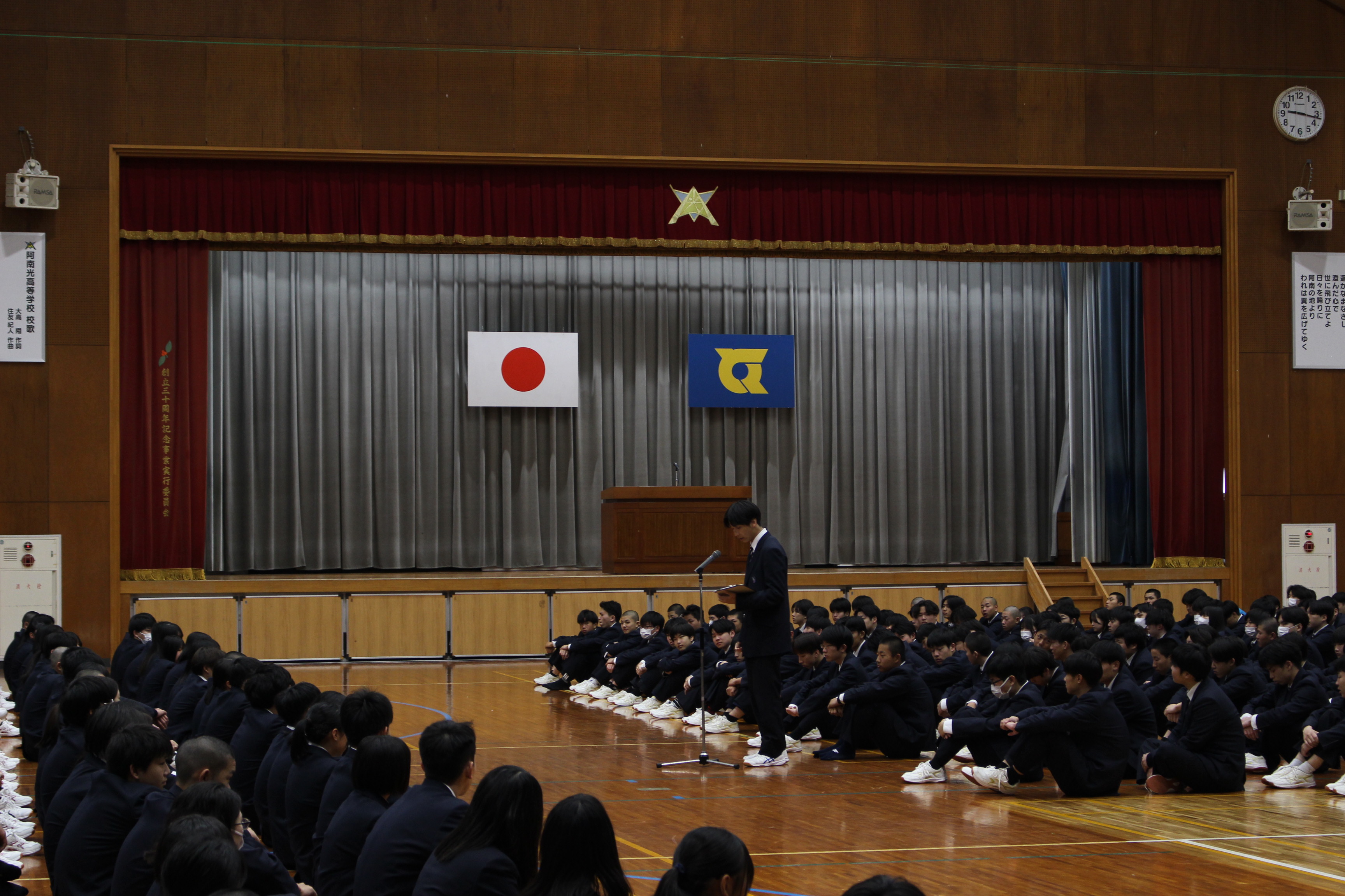 学校長の訓話では、「一年間を振り返る節目として、自らの成長や課題を見つめ直してほしい」との話がありました。竹が節を持つことで、しなやかさと強さを兼ね備え成長していくように、人も節目を大切にすることで、次の成長へとつながっていくと述べられました。また、第98回センバツ高等学校野球大会において、「All Anan」の姿が多くの人に感動を与えたことに触れ、選手一人ひとりの努力だけでなく、応援してくれた人々、地域、OBとのつながりが大きな力となっていることを強調されました。最後に、努力する人を応援し、人から応援される存在であろうとする心構えこそが、今まさに刻まれている一生の「節」を形づくっていくのだと締めくくられました。