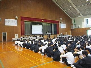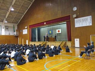 始業式では校長先生より、人生100年時代を力強く生き抜くために必要な「学び続ける力」の重要性についてのお話がありました。特に3年生は現在各自が進路に向けて努力をしているので、真剣に耳を傾けている様子でした。