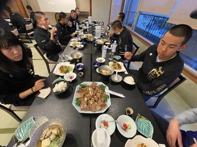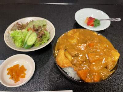 夕食はカツカレーです。生徒はリラックスして普段と変わりなく過ごしています。