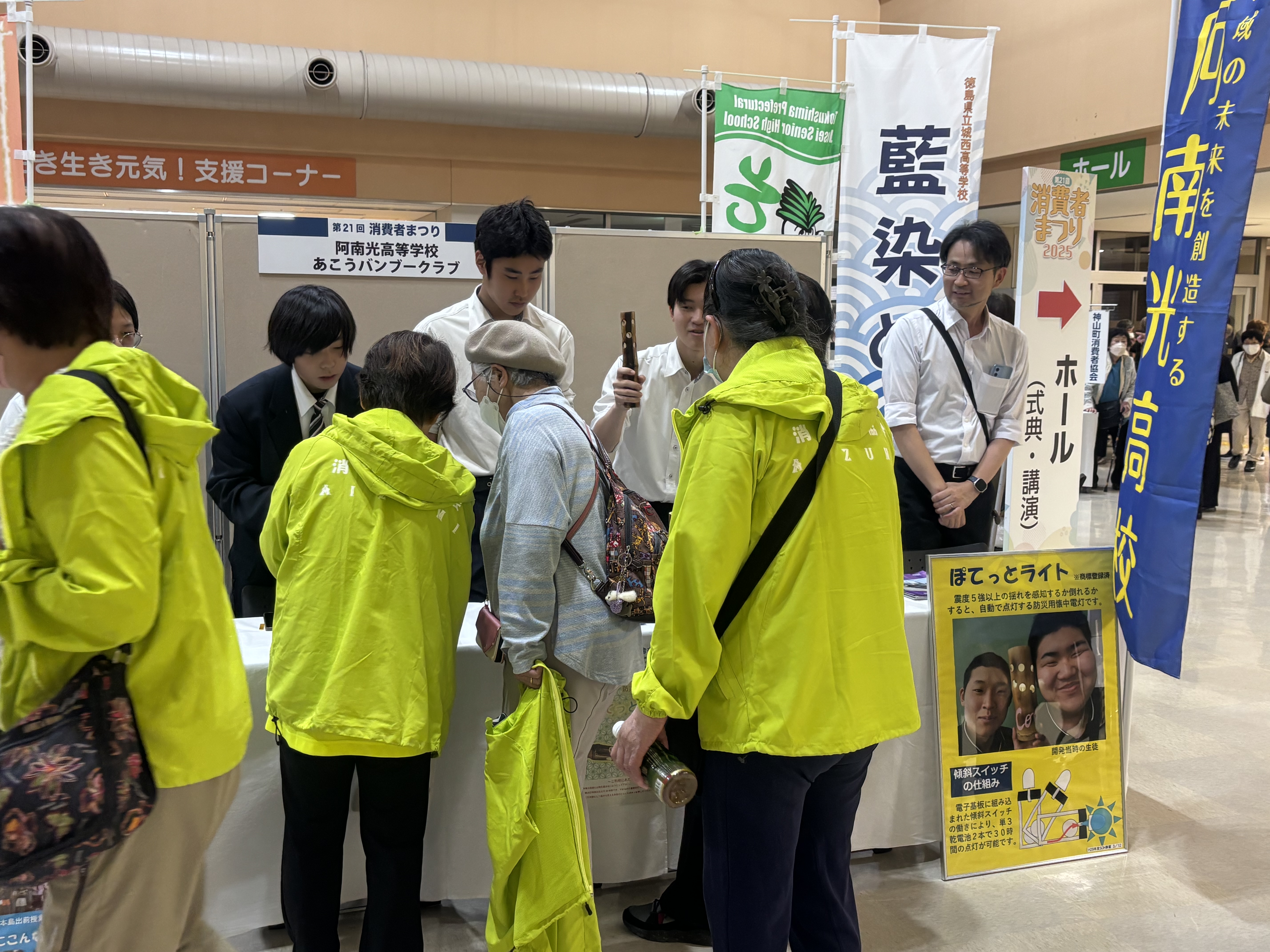 クラブの部員が本校オリジナルの防災用品を展示し、説明を行いました。「ぽてっとライト」や