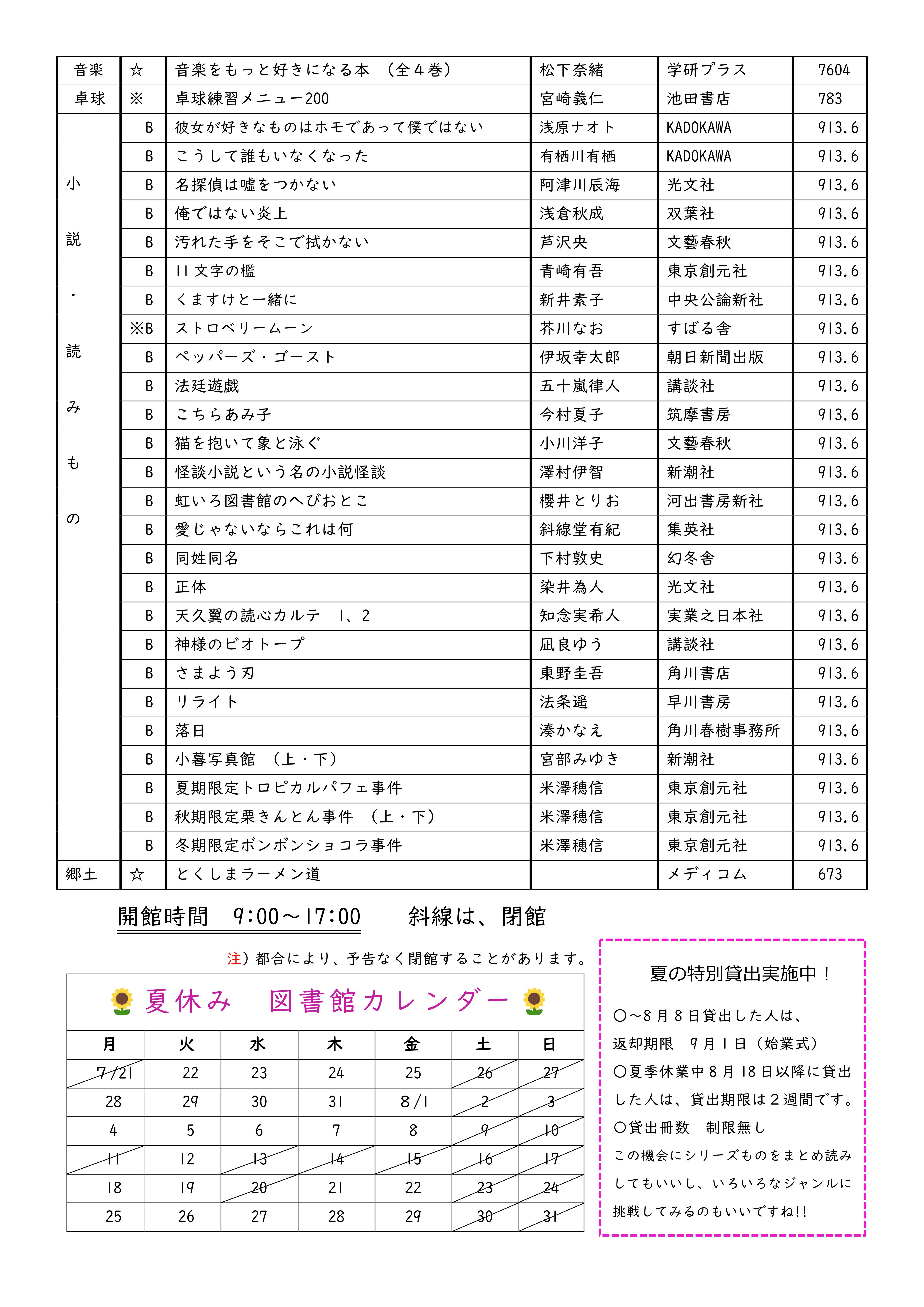 2025年7月18日 08時00分 [図書・情報課]図書館は夏休み中、一番下掲載のカレンダーのとおり、開館しています。